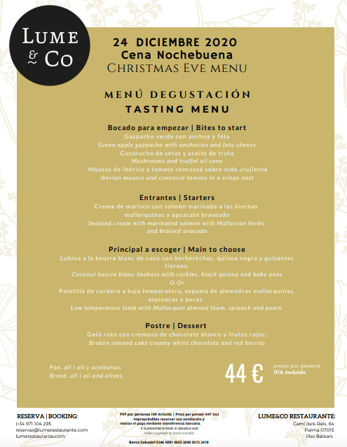 Lume & Co también presenta su propuesta de menú de nochebuena y nochevieja para pasar con tu familia en Palma de Mallorca, recuerda, de 6 en 6. En esta ocasión también cuentan con un menú especial para niños. Puedes ver e menú para noche buena aquí o haciendo click en la siguiente foto.